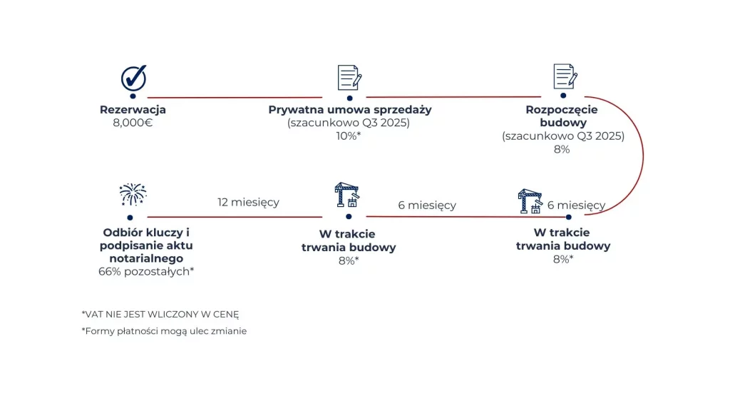 • Po dokonaniu rezerwacji następuje podpisanie prywatnej umowy kupna-sprzedaży po uzyskaniu pozwolenia na budowę.