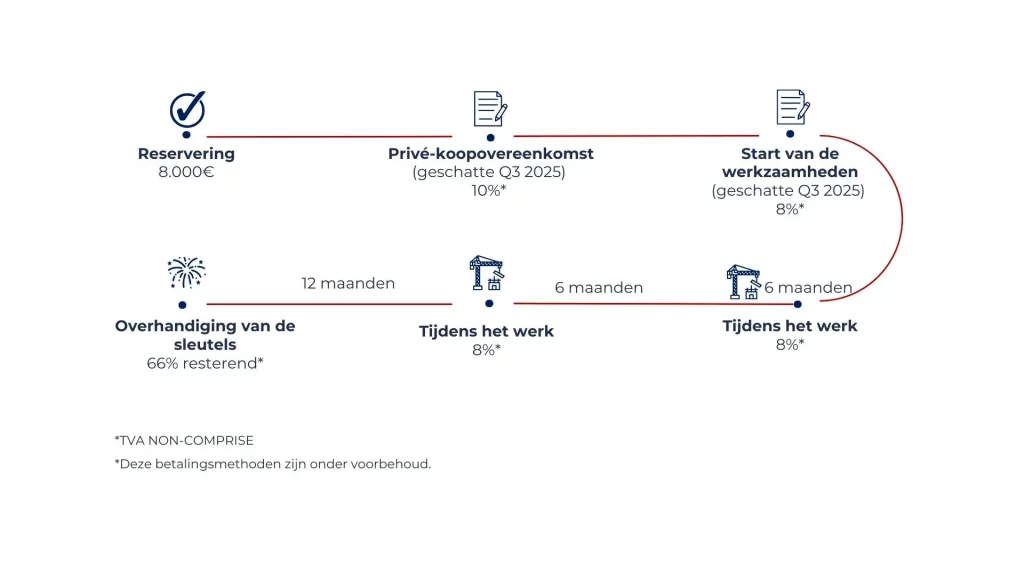 • Na de reservering wordt het koop- en verkoopcontract tussen particulieren getekend zodra de bouwvergunning is verkregen.
